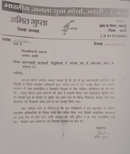 बस्ती, 25 अप्रैल : लाइव भारत समाचार ;- आंगनवाड़ी कार्यकत्रियों की नियुक्ति में जिला कार्यक्रम अधिकारी द्वारा व्यापक स्तर पर धन उगाही का आरोप लगाते हुये भारतीय जनता युवा मोर्चा के जिलाध्यक्ष अमित गुप्ता ने मामले की निष्पक्ष जांच कराने की मांग किया है। शिकायती पत्र सौंपते समय प्रदीप चौधरी, ऊधव सिंह, राजन कन्नौजिया, सूर्यमणि पाण्डेय, विकास सिंह आदि उपस्थित रहे।