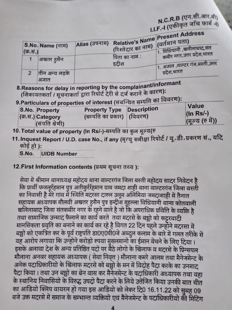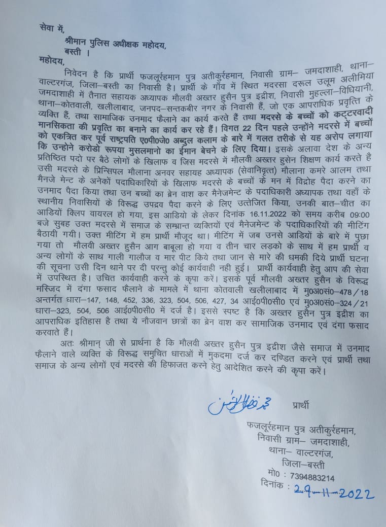 बस्ती, 30 नवम्बर लाइव भारत समाचार:-उत्तर प्रदेश जिला बस्ती वाल्टरगंज थाना क्षेत्र के मदरसा दारुल उलूम अलिमिया जमादाशाही के शिक्षक मौलवी अख्तर हुसैन पर लगे गंभीर आरोप,ग्राम निवासी फजलुररहमान ने लगाया गंभीर आरोप, पुलिस को दिये गये तहरीर में कहा गया है कि मौलाना अख्तर हुसैन मदरसे के छात्रों का ब्रेनवास कर दंगा करवाने की साजिस कर रहे है, मौलाना मदरसे में शिक्षण कार्य के दौरान पूर्व राष्ट्रपति एपीजे अब्दुल कलाम के बारे में तथ्यहीन जानकारी देकर युवाओं को भड़काने का भी कोशिश किया है,मामले को लेकर वाल्टरगंज थाने में मुकदमा पंजीकृत कर लिया गया है, मदरसा जमदाशाही में तनाव व्याप्त है