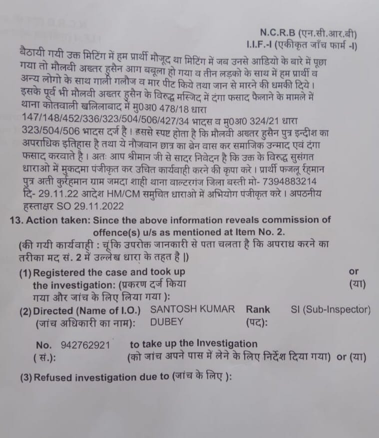 (सेवानिवृत्ति), सहायक अध्यापक मौलाना कमरे आलम तथा मैनेजमेन्ट के अनेको पदाधिकारियो के खिलाप मदरसे के बच्चो के मन में विद्रोह पैदा करने का उनमाद पैदा किया तथा उन बच्चो का ब्रेन वास कर मैनेजमेन्ट के पदाधिकारियो, अध्यापको तथा वहा के स्थानीय निवासियो के विरूद्ध उपद्रव पैदा करने के लिए उत्तेजित किया, उनकी बातचीत का आडियो क्लिफ वायरल हो गया, इस आडियो को लेकर दिनांक 16 नवम्बर को समय करीब 9 बजे सुबह मदरसे मे समाज के सम्भ्रान्त व्यक्तियो एंव मैनेजमेन्ट के पदाधिकारियो की मीटिग बैठाई गई,मीटिग में जब उनसे आडियो के बारे में पूछा गया तो मौलवी अख्तर हुसैन आग बबूला हो गए ,और तीन चार लड़को के साथ में अन्य लोगो के साथ गाली गलौज व मार पीट किये जान से मारने की धमकी दिये, इसके पूर्व मौलवी अख्तर हुसैन के विरूद्ध मस्जिद में दगा फसाद फैलाने के मामले में थाना कोतवाली खलीलाबाद में दो मुकदमे दर्ज है, बस्ती एसपी आशीष श्रीवास्तव ने कहा ऑडियो के आधार पर मौलाना के खिलाफ मुकदमा पंजीकृत कर लिया गया है प्रथम दृष्टया दोष सिद्ध होने पर मौलाना के खिलाफ कड़ी कार्यवाही की जाएगी ।
